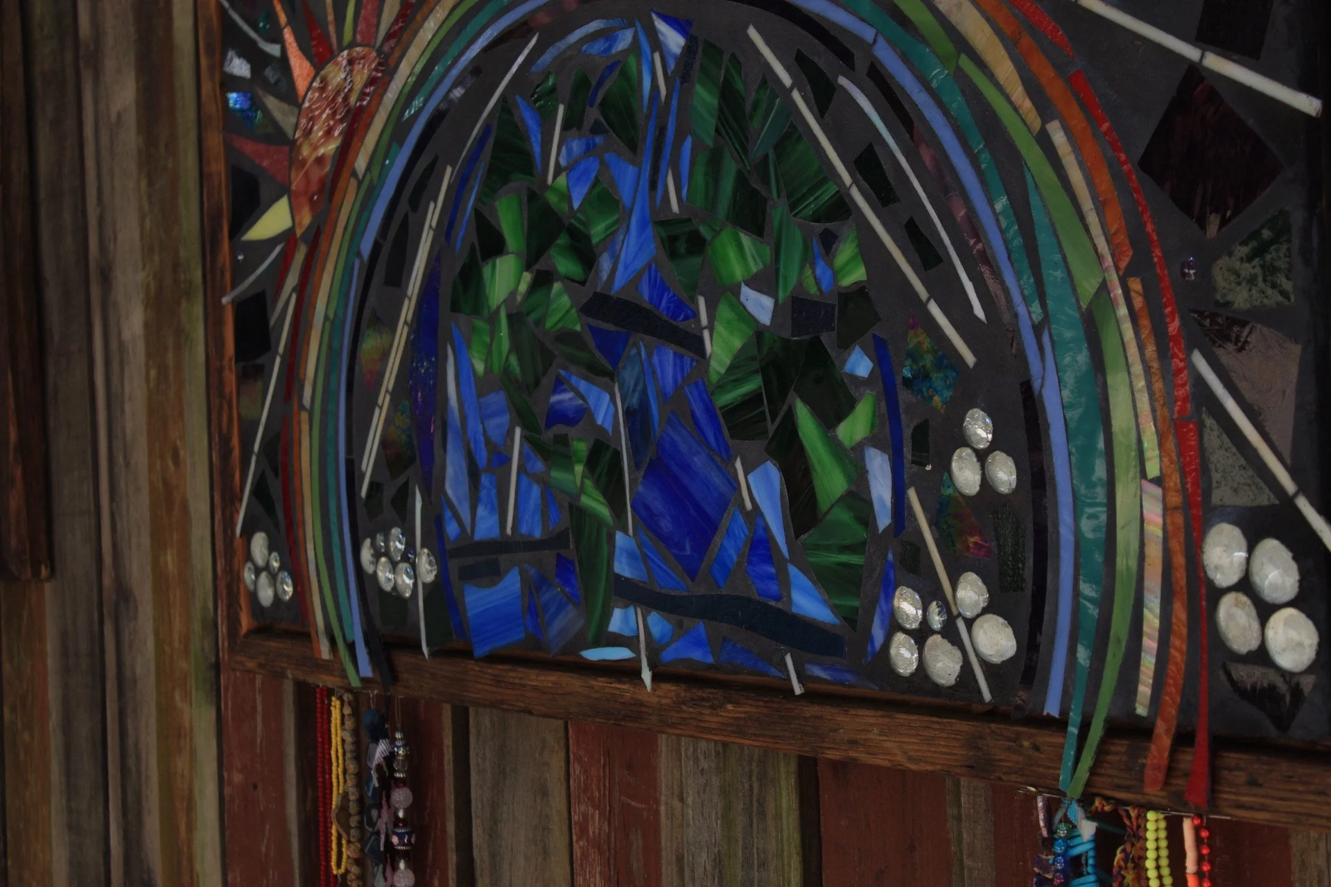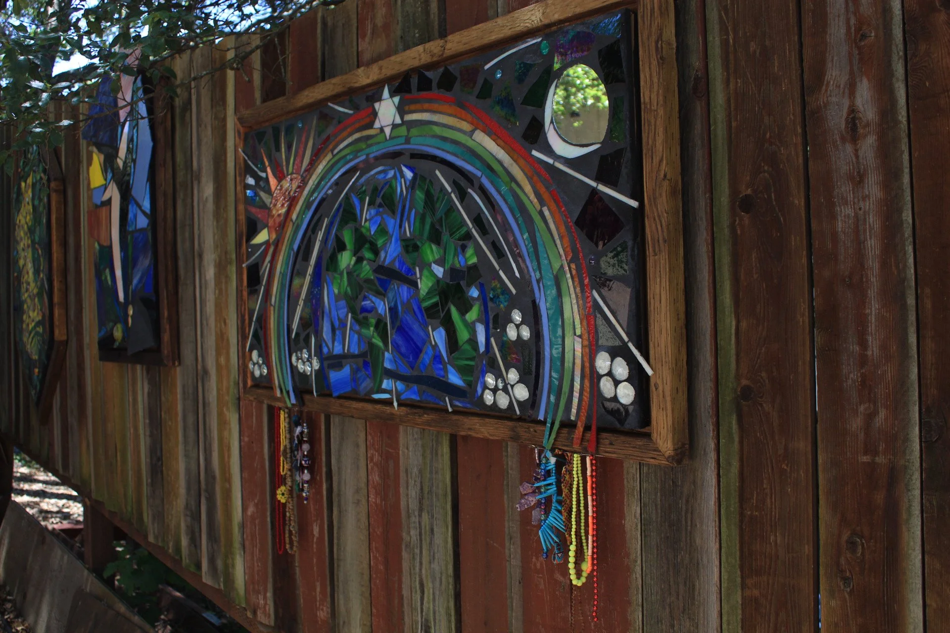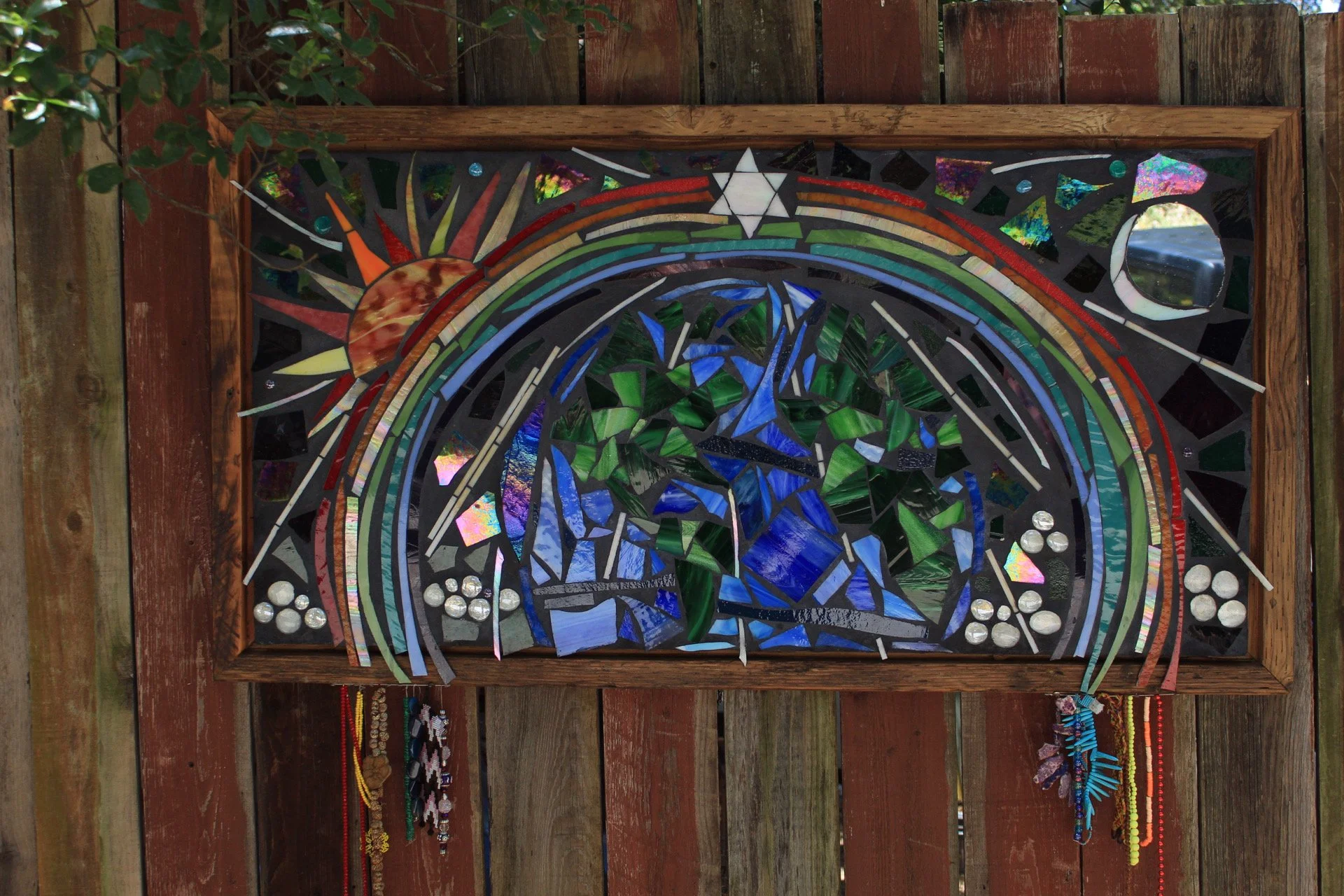 Hand-cut stained glass, ceramic tile, mirror, beads, and mixed media on wood