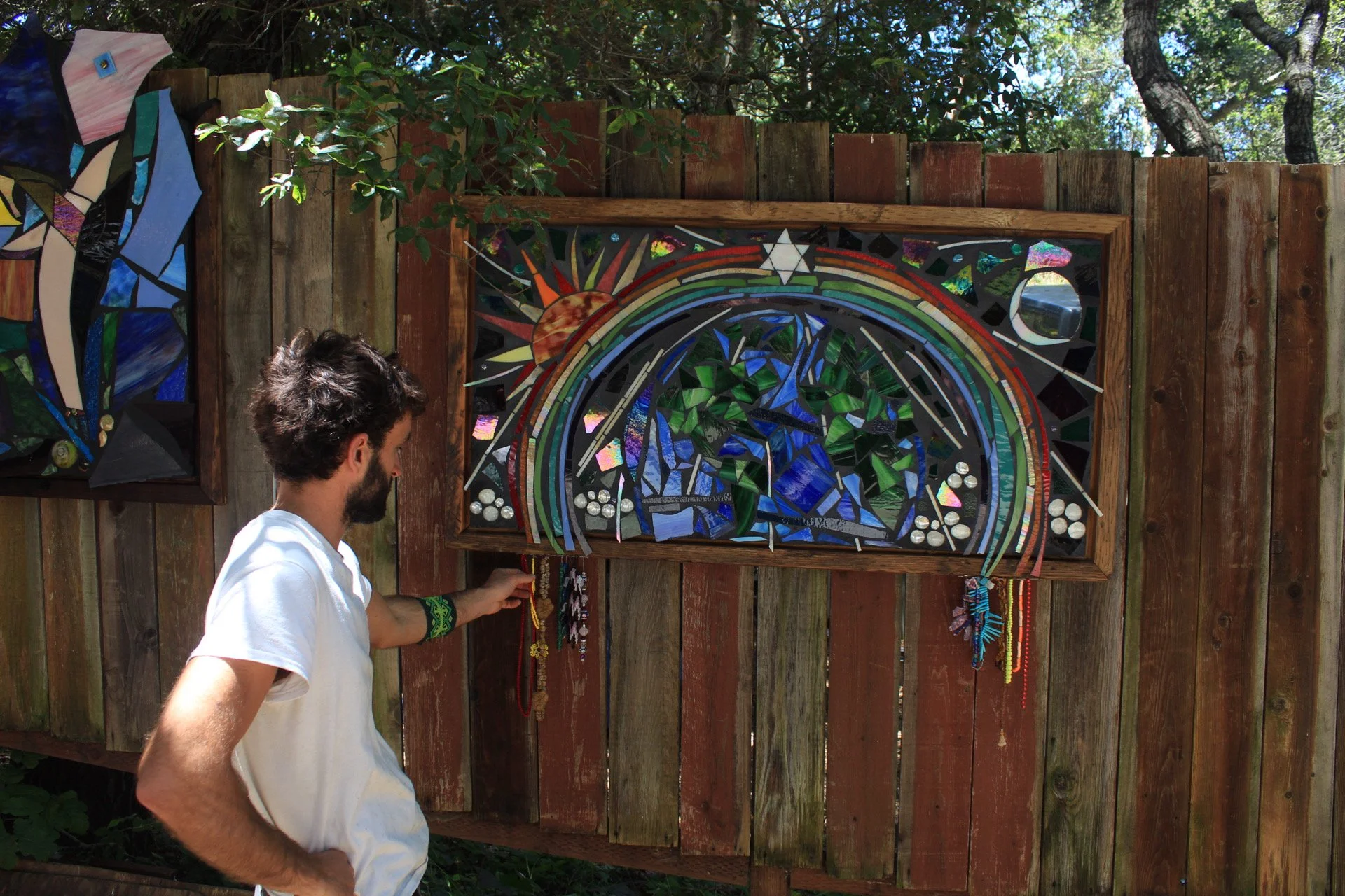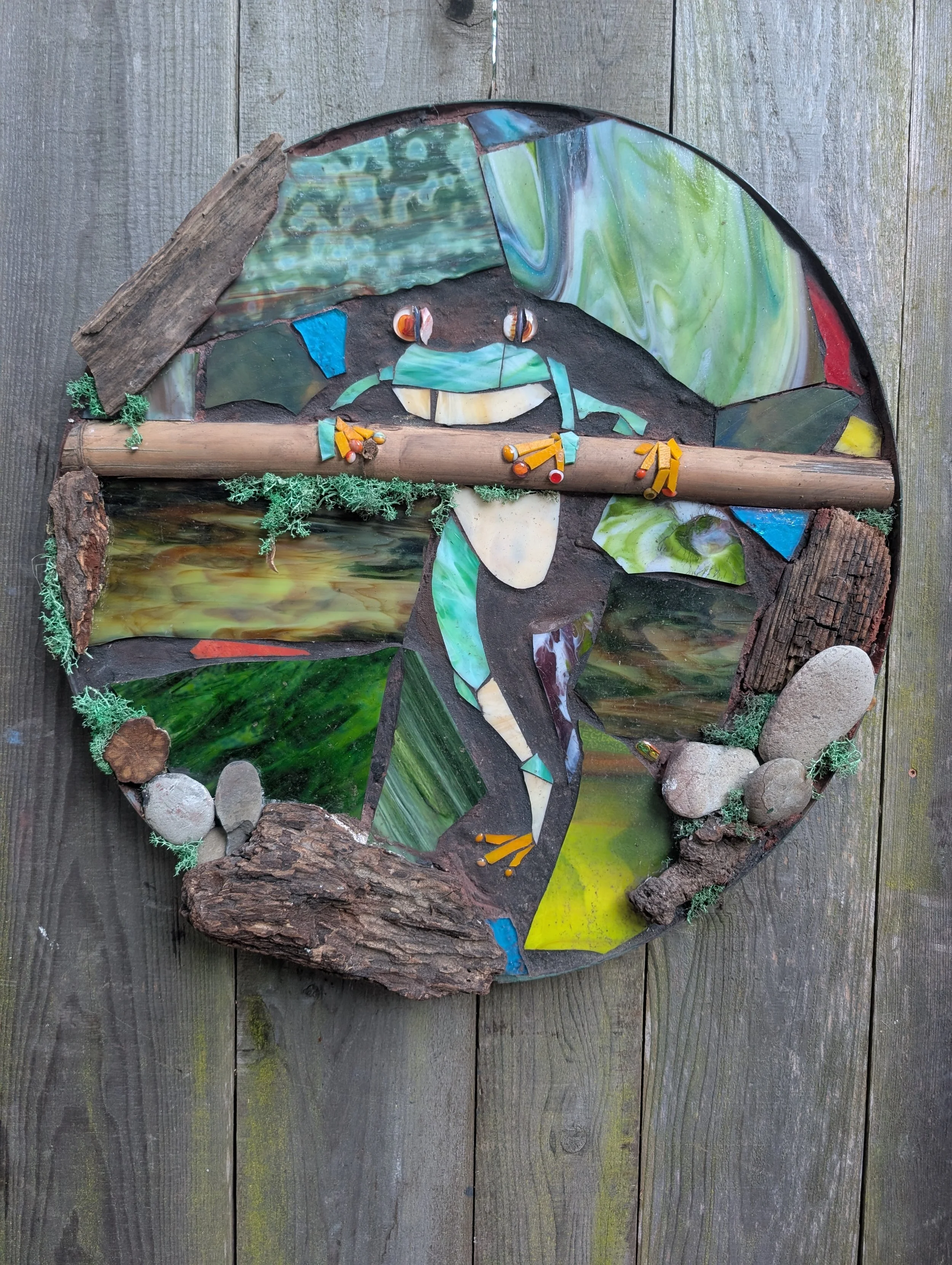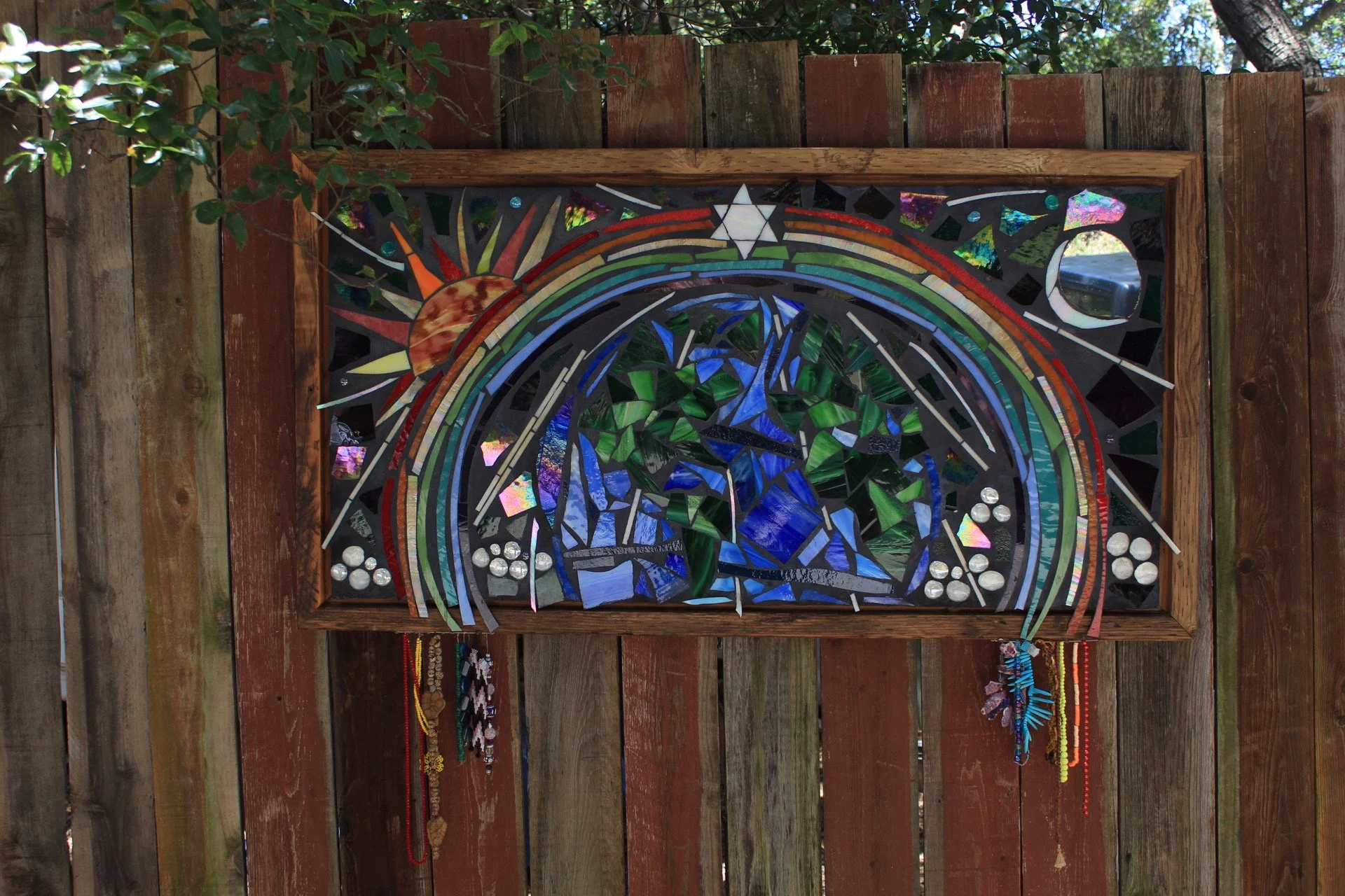 Hand-cut stained glass, ceramic tile, mirror, beads, and mixed media on wood