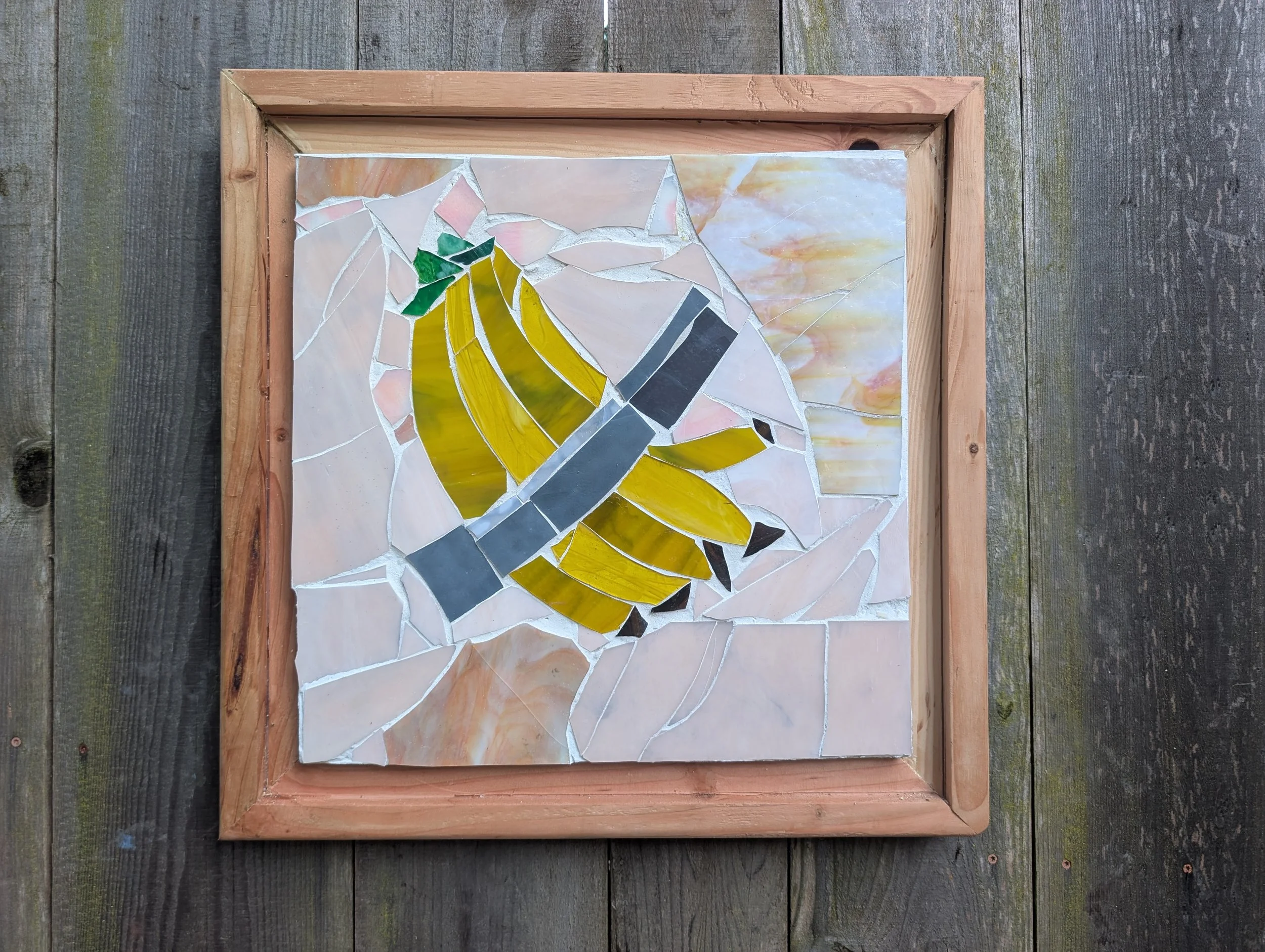 Hand-cut stained glass, ceramic tile, mirror, and mixed media on wood