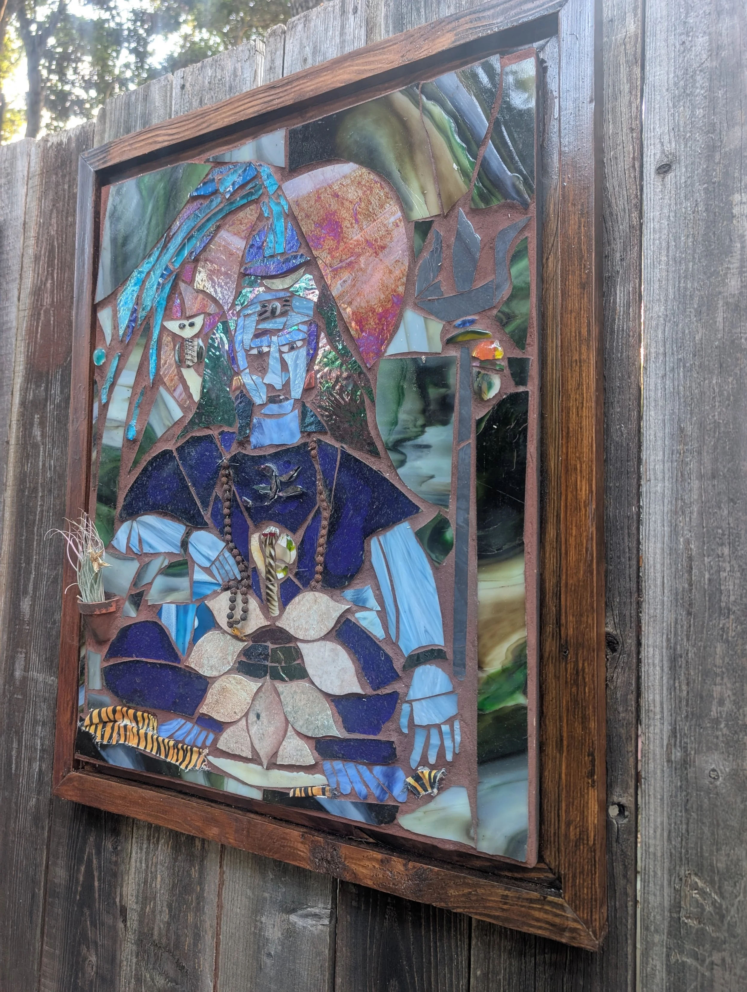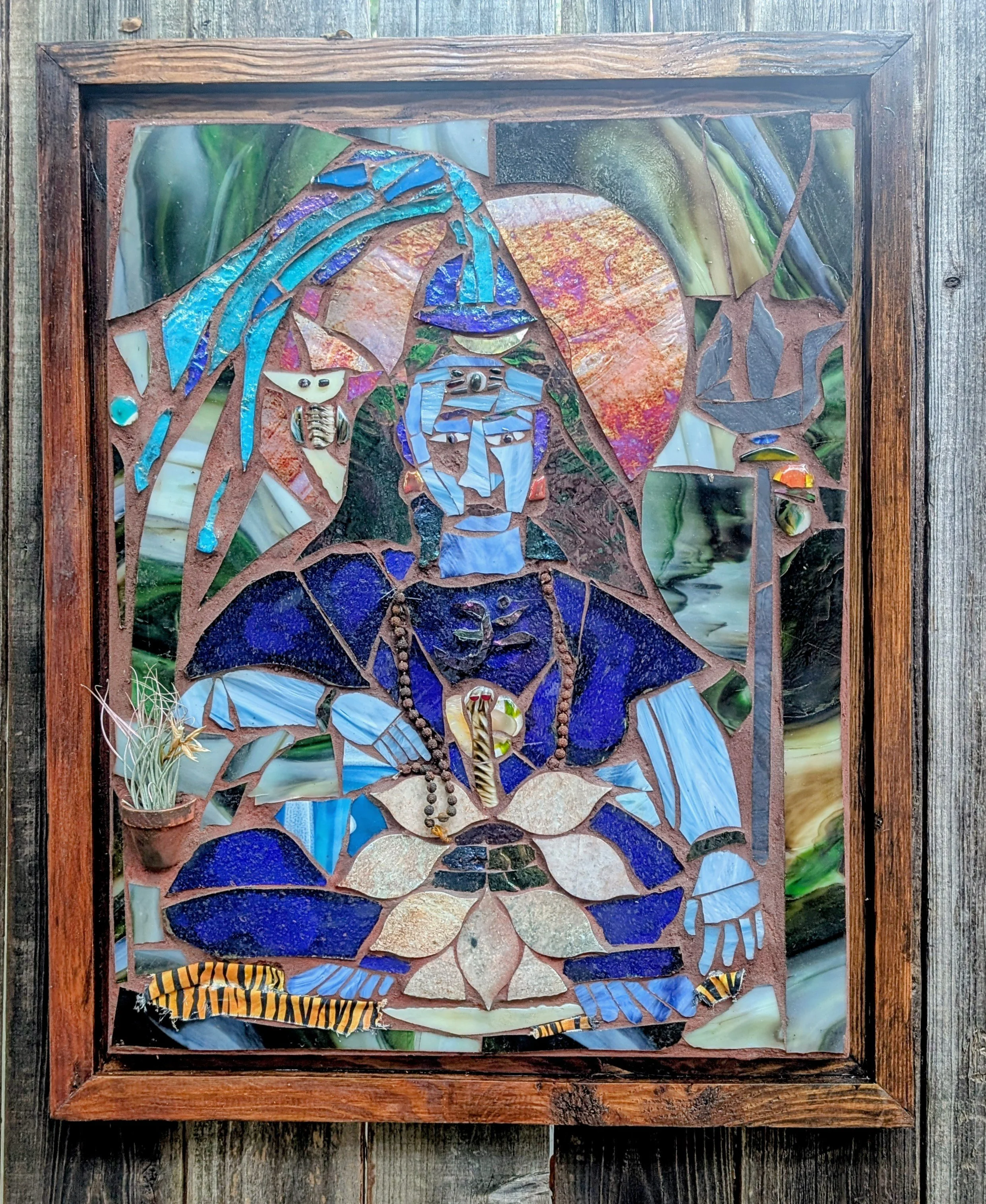 โShiva of the Blue Flame is a devotional mosaic honoring the great yogi and destroyer of illusion โ Shiva, the transformer, the stillness within chaos, the eternal flame. Composed of deep lapis blues, earthy tones, and radiant glass, this sacred portrait includes the full iconography.