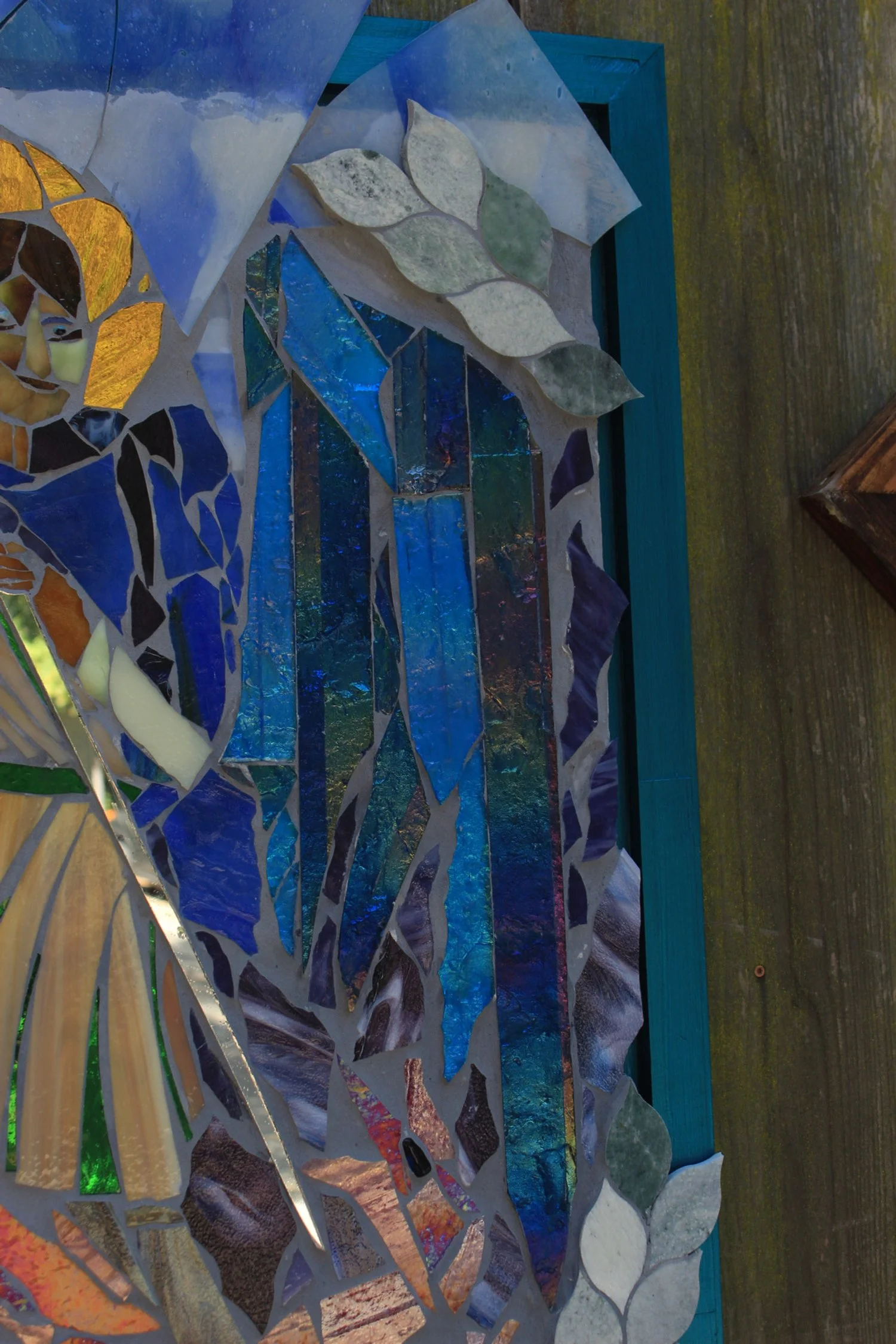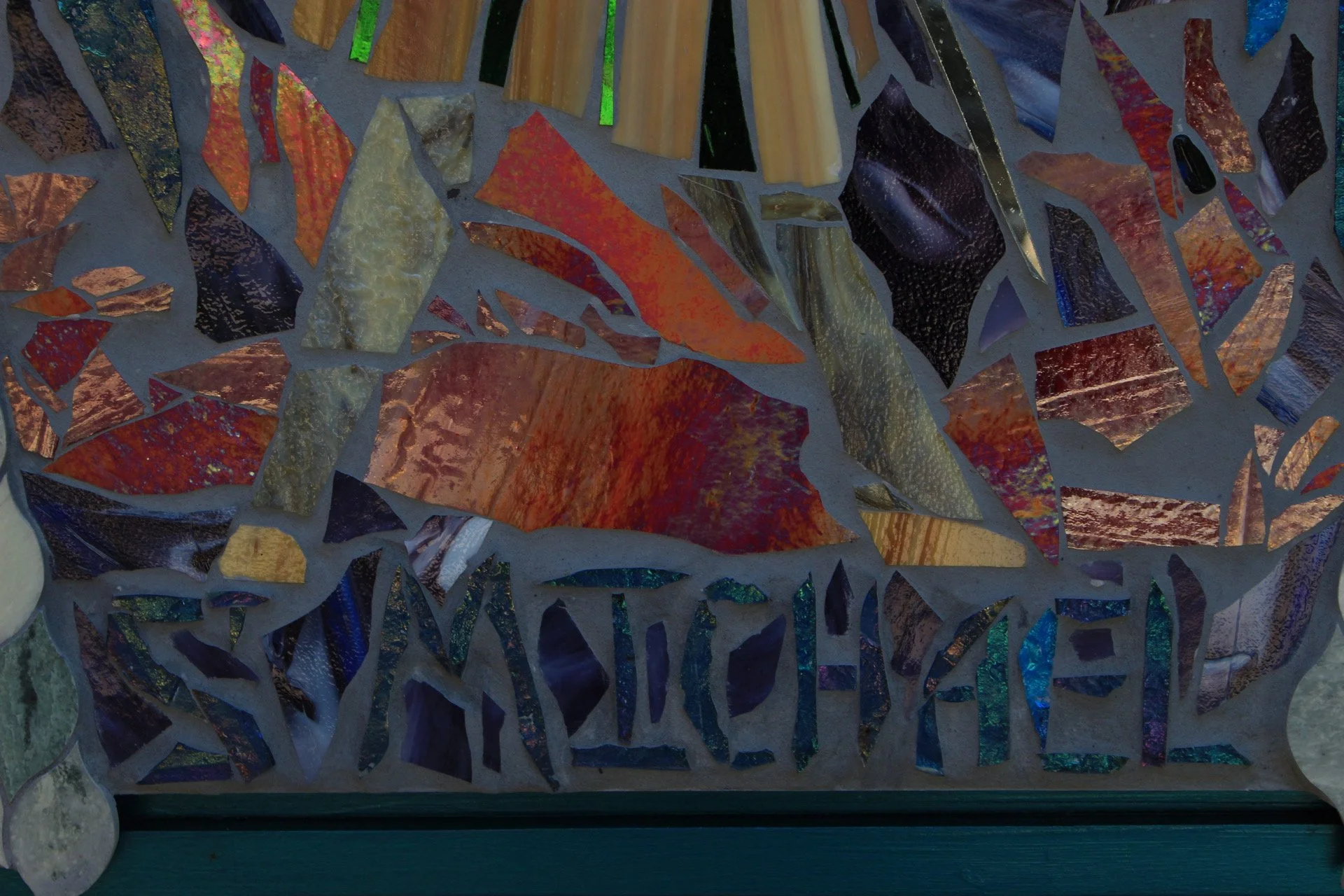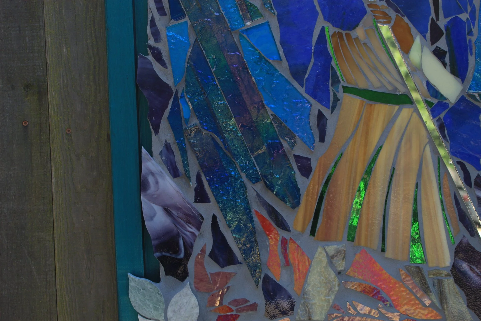 Medium: Hand-cut stained glass mosaic with natural materials, gemstone inlays, air plant, and mixed media