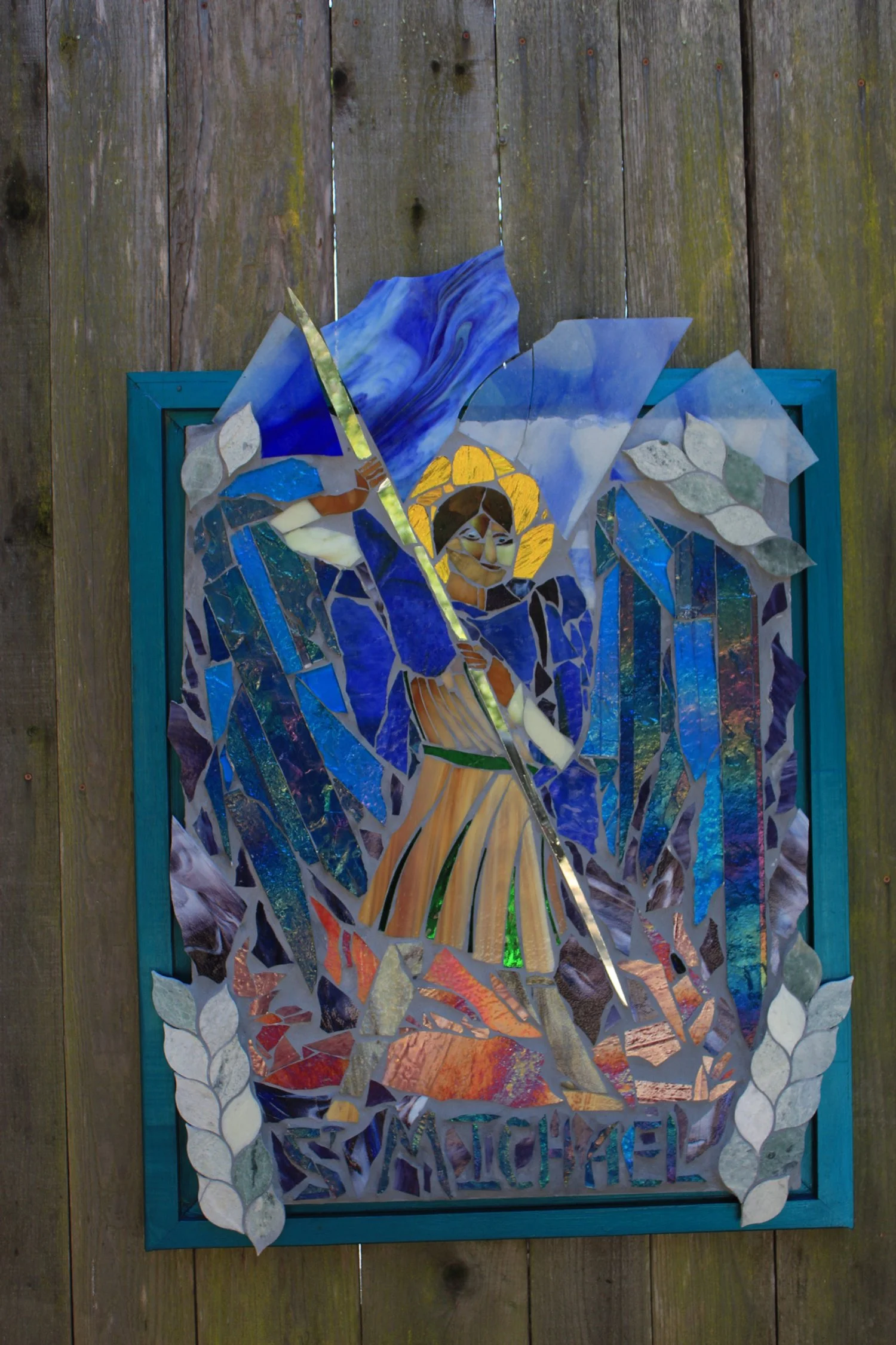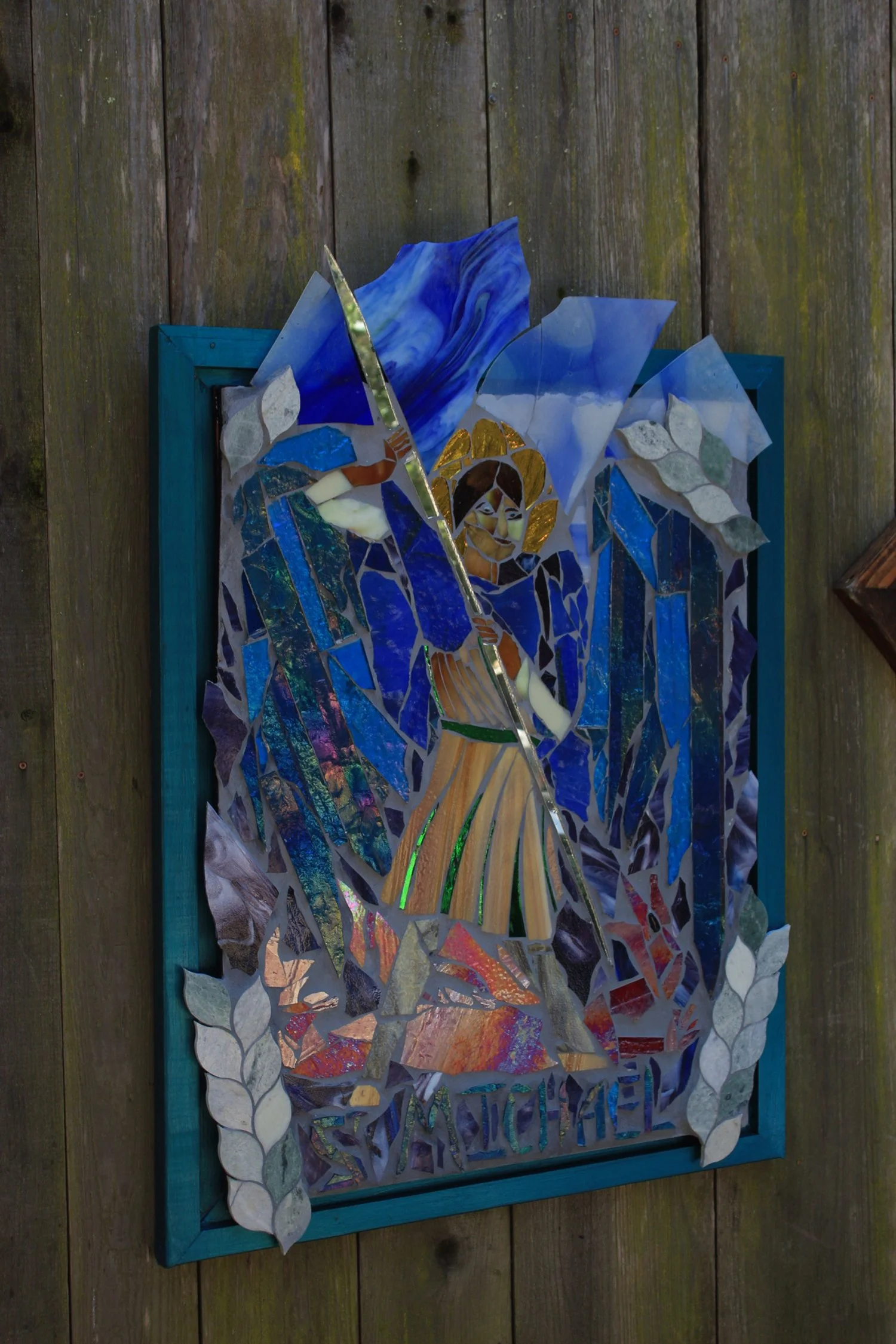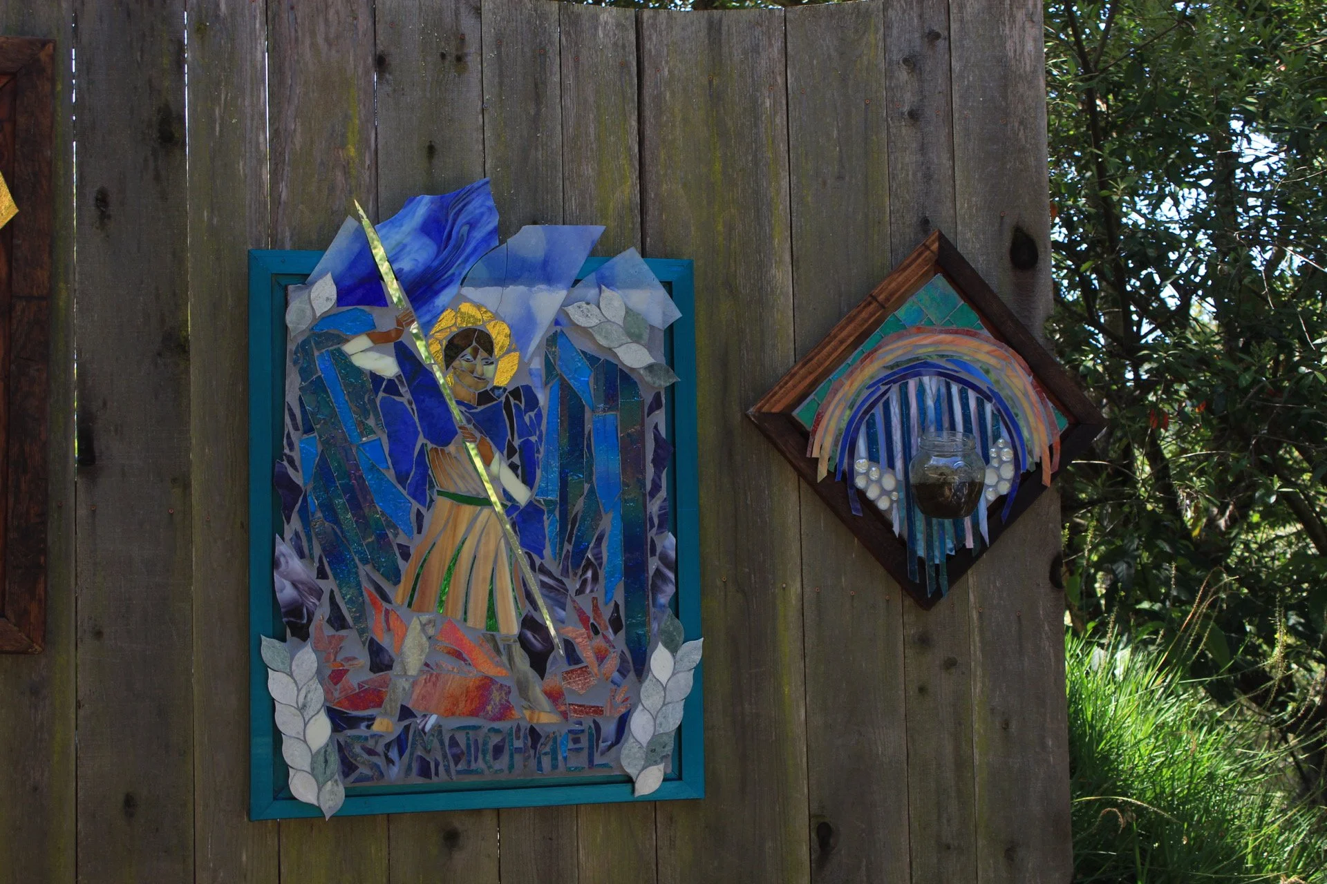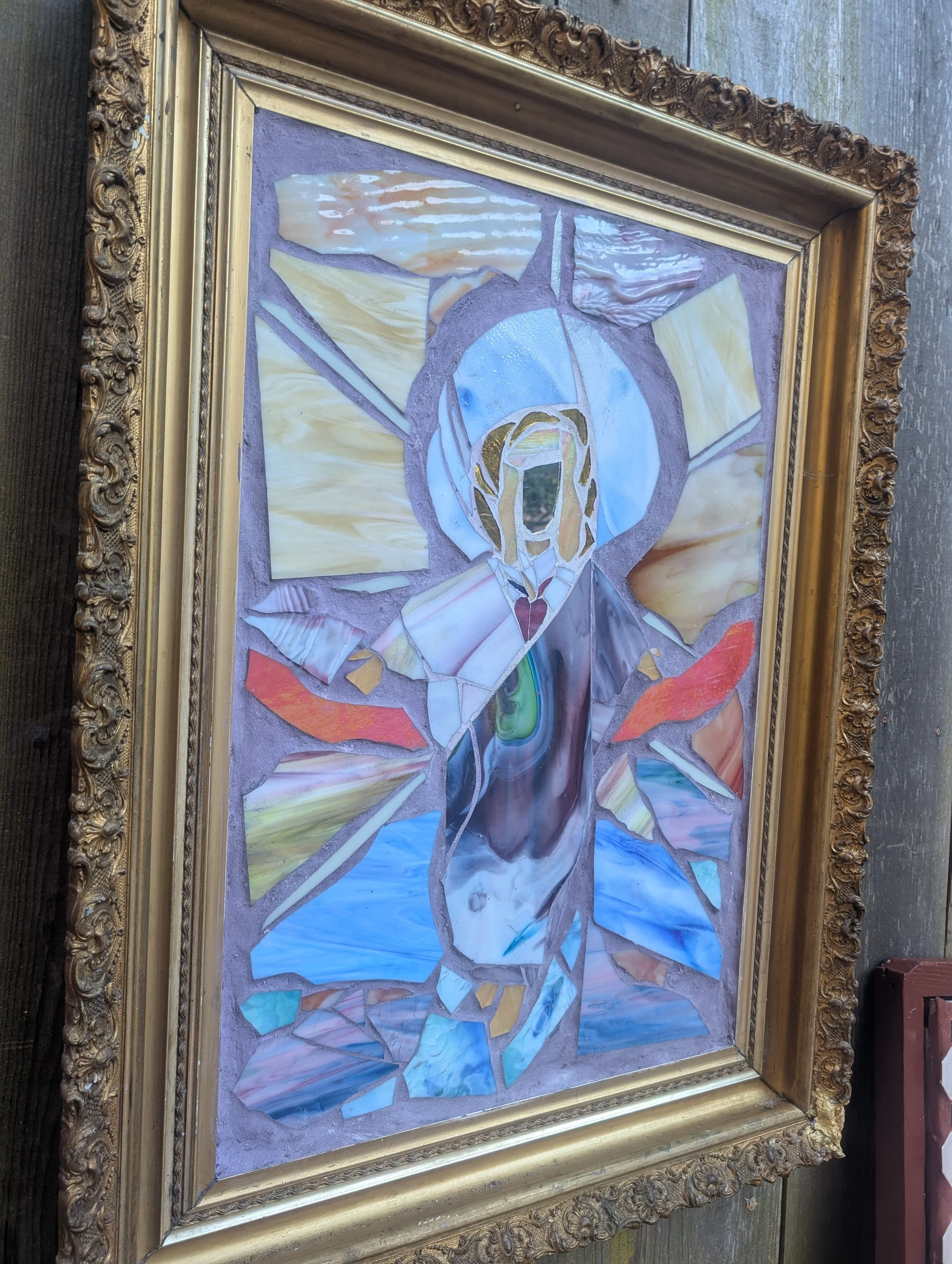 Medium: Hand-cut stained glass mosaic with natural materials, gemstone inlays, air plant, and mixed media