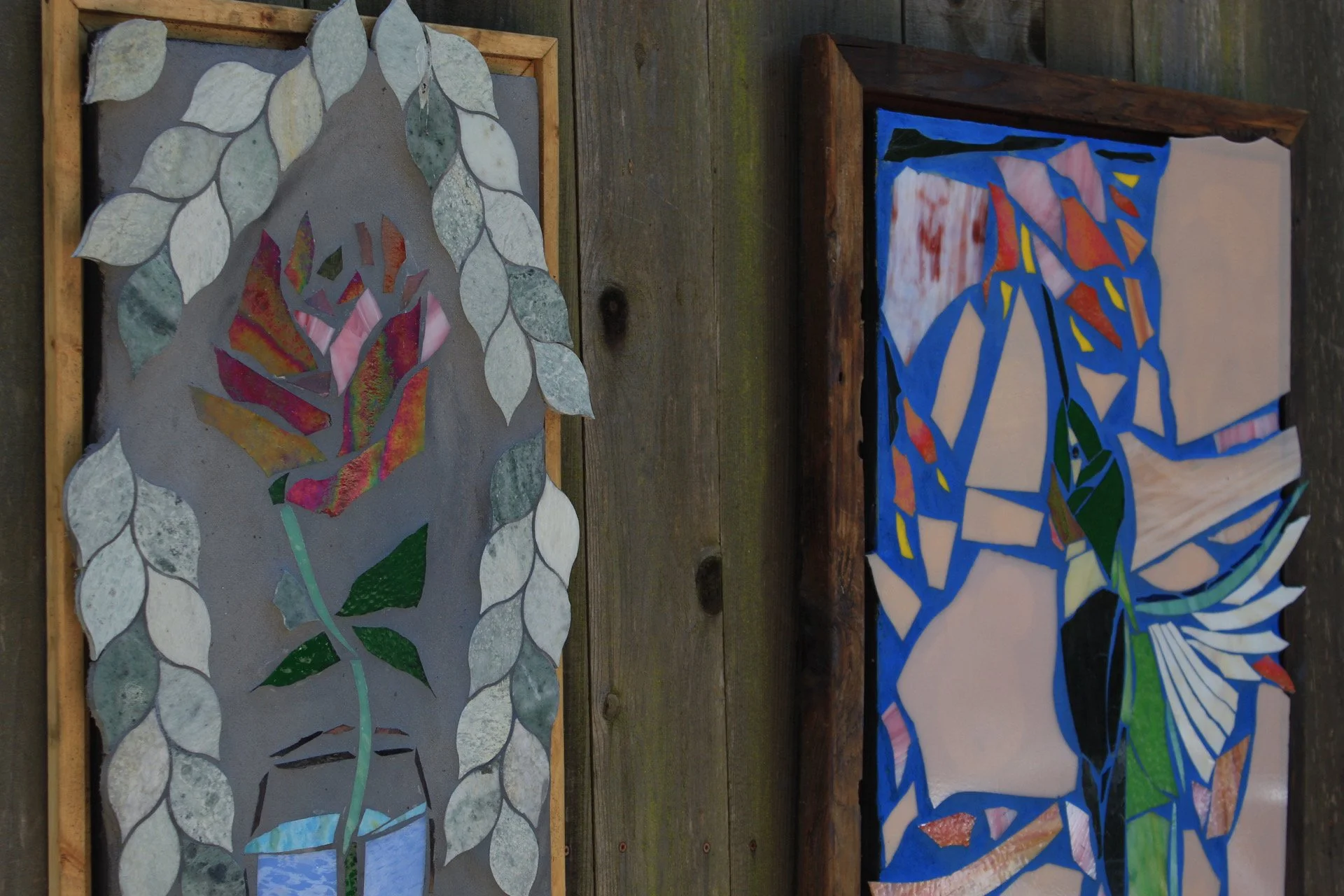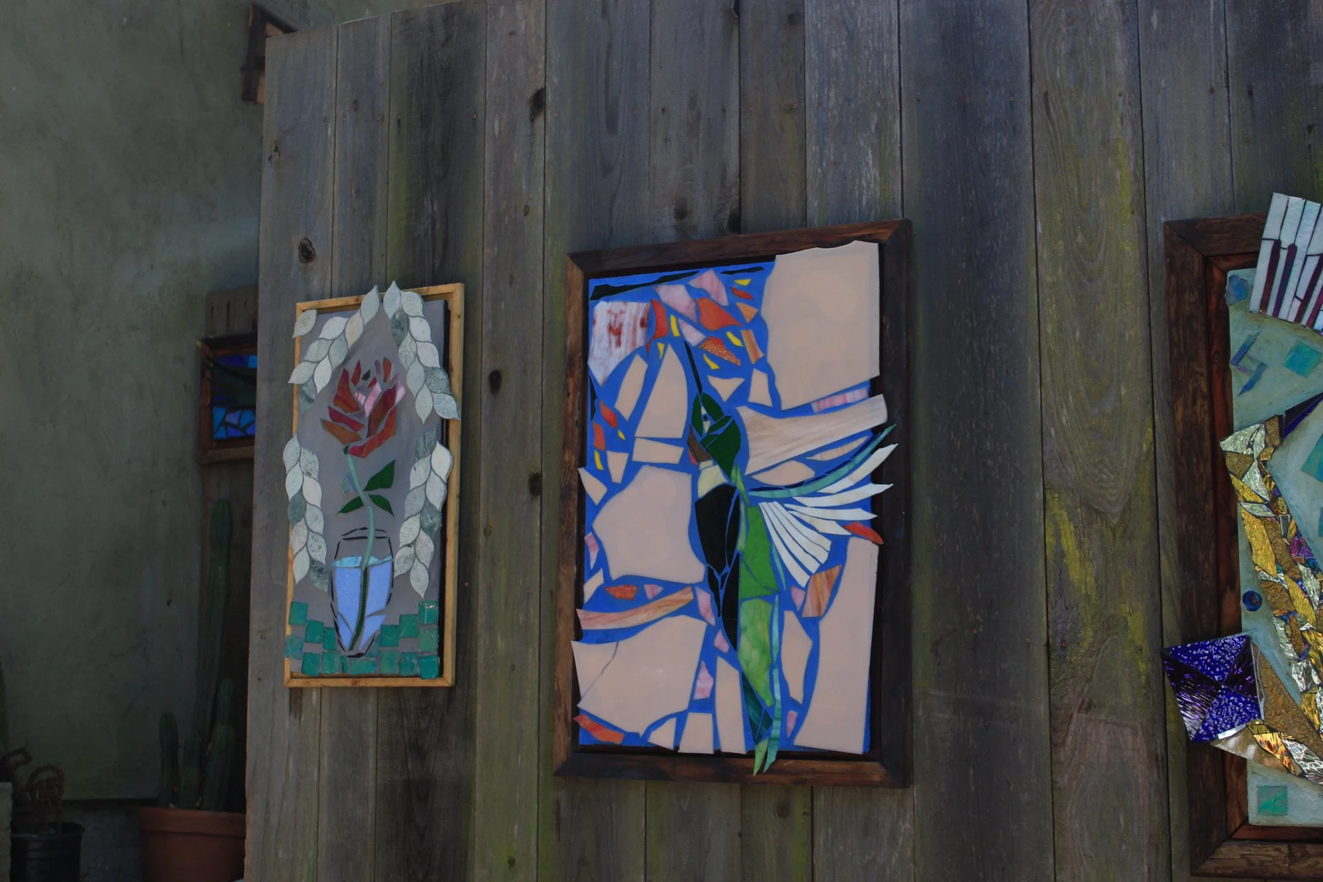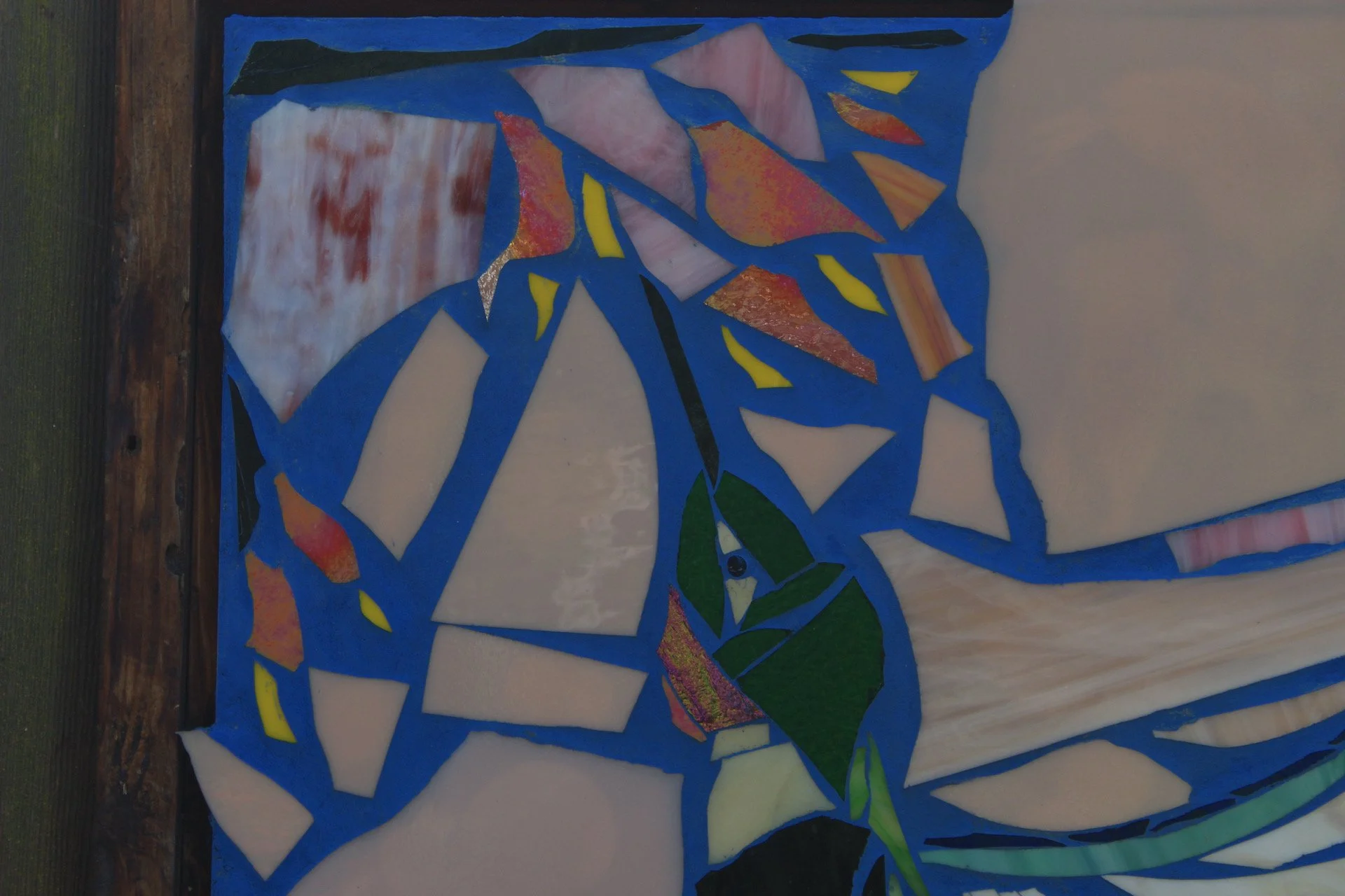 Hand-cut stained glass, ceramic tile, iridescent glass, and mixed media on wood